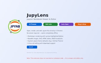 JupyLens är en användbar Chrome-tillägg som gör det möjligt att öppna, visa och redigera Jupyter/IPython Notebook (.ipynb) filer direkt i webbläsaren. Med ett fokus på enkelhet, kräver det ingen installation av Jupyter-server eller Python, vilket gör det lättillgängligt för användare. Den erbjuder omedelbar rendering av .ipynb-filer med formaterad markdown och syntaxmarkerad Python-kod. Användare kan också enkelt redigera cellinnehåll och spara sina ändringar direkt i webbläsaren.